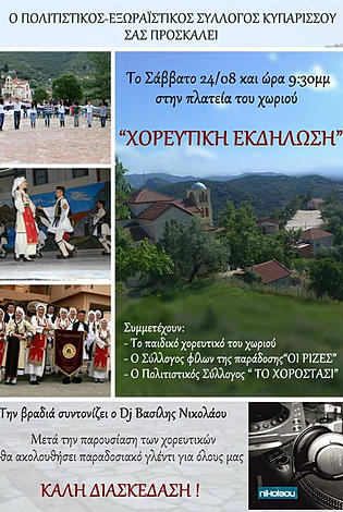 24 Αυγούστου 2013. Η μέρα της Χορευτικής Εκδήλωσης στην Κυπάρισσο Αγρινίου. Όλοι οι κάτοικοι δέχτηκαν με μεγάλη χαρά να βοηθήσουν την προσπάθεια του Συλλόγου να διοργανώσει την εκδήλωση, τιμώντας με αυτό τον τρόπο την παράδοση και την περήφανη καταγωγή μας, προσφέροντας ηθική, υλική και οικονομική στήριξη (δεν έλειψαν βέβαια και οι γκρίνιες, αλλά δεν χαλάμε τις καρδιές μας!!!) Αξίζει να σημειωθεί ότι πέρασαν αρκετά χρόνια (περισσότερα από 10), όπου έχει να παρουσιαστεί κάποια "πολιτιστική'' δραστηριότητα στην Κυπάρισσο.
